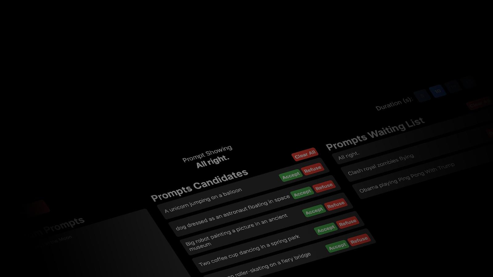 Prompts are queued, enabling large scale participation. Each participant can track their position in the queue and see which prompt is currently shaping the video. As a prompt reaches the top, the continuous video stream gradually evolves in response, making each contribution visible and shared.